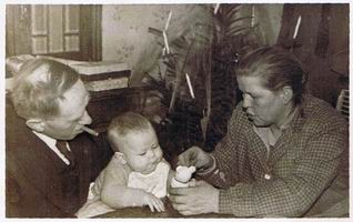 ![]() Christian Rathkjen og Maren Rathkjen *Knudsen med deres barnebarn Ole Rathgen Hedegaard i julen 1954 |